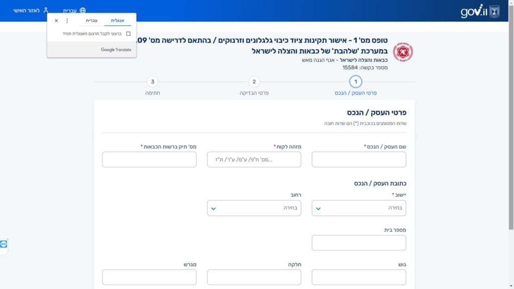 הטופס נלקח מאתר הרשות הארצית לכבאות והצלה, והוא משמש לרישוי עסקים ונכסים הקשורים לתחום הכבאות וההצלה.