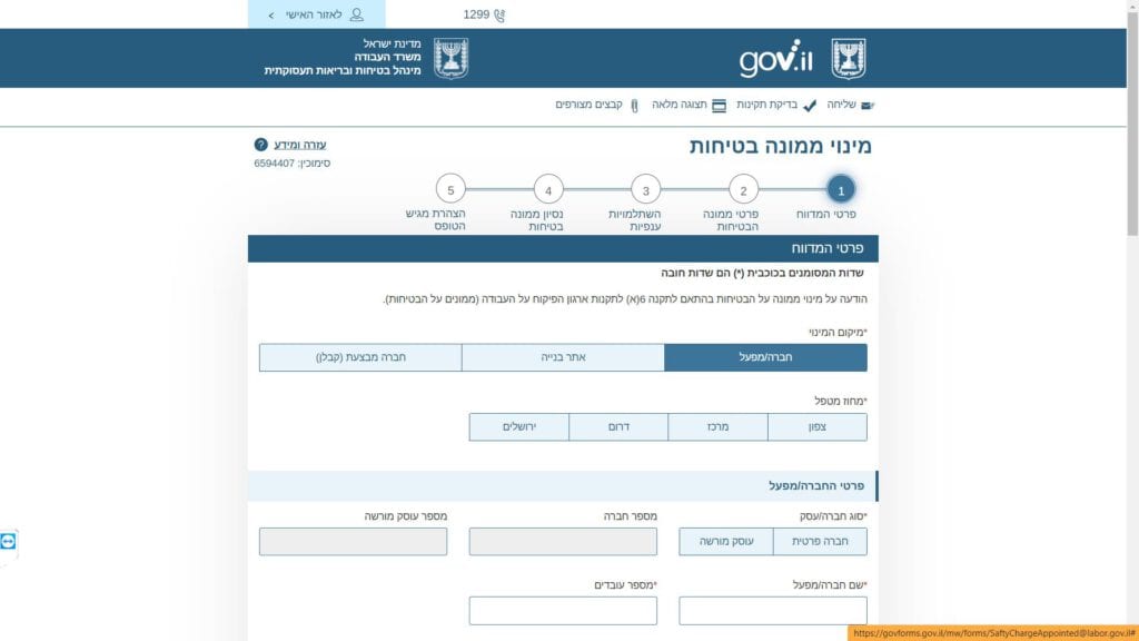 צילום מסך טופס בקשה לאישור מינוי ממונה על הבטיחות במקום העבודה טופס מקוון