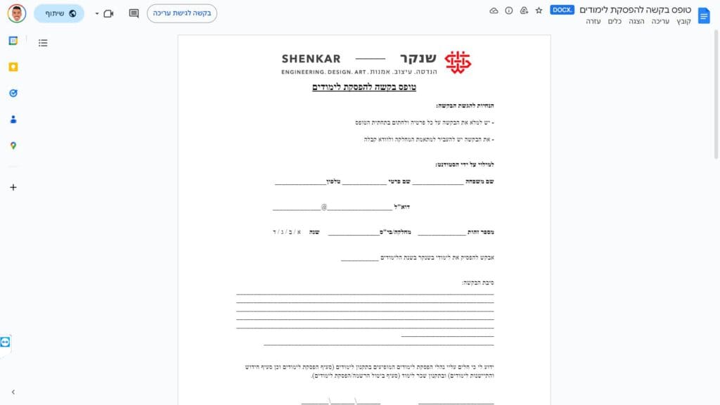טופס קל » מוסדות לימוד » מכללת שנקר » מינהל אקדמי » טופס בקשה להפסקת לימודים