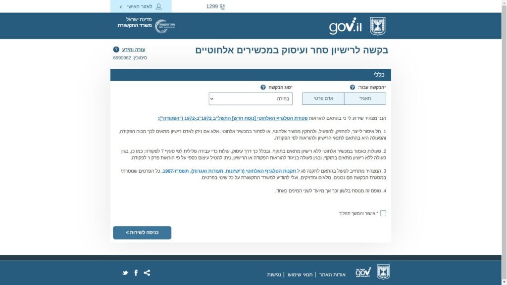 צילום מסך טופס בקשה לרישיון סחר במכשירים אלחוטיים טופס מקוון