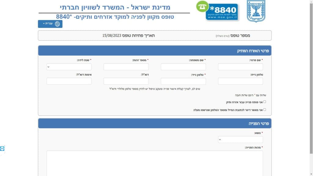 גוף שיתמוך בשאלות על טופס המוקד לאזרחים ותיקים