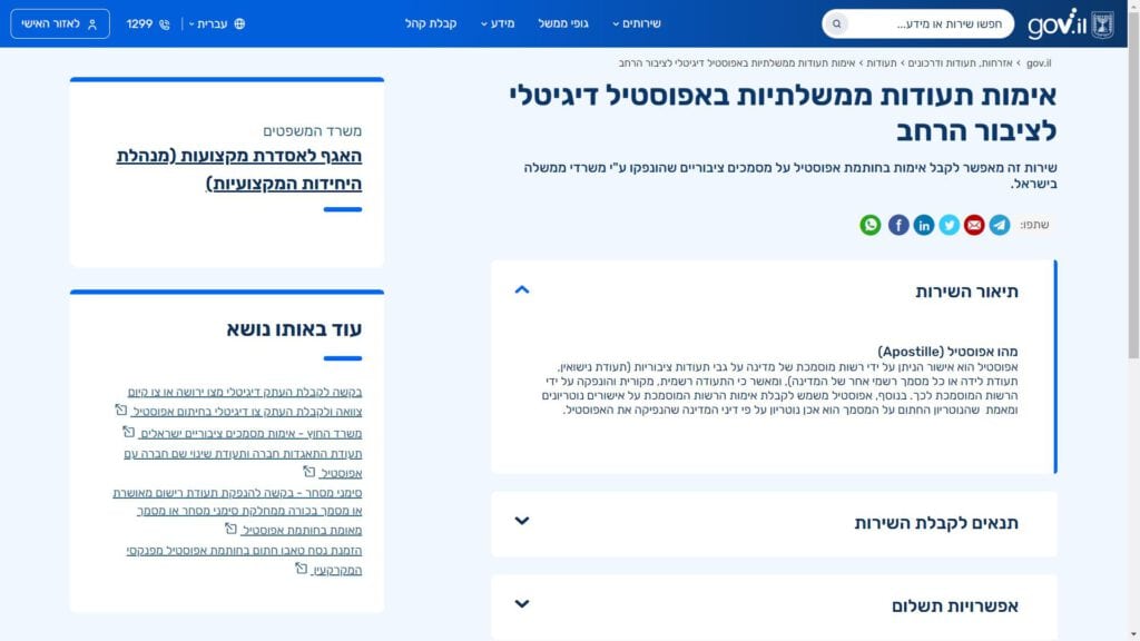 צילום מסך טופס אימות תעודות ממשלתיות באפוסטיל דיגיטלי לציבור הרחב טופס מקוון