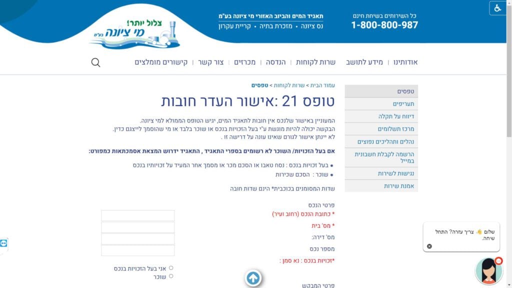 הטופס בשם "טופס מי ציונה - אישור העדר חובות" (טופס 21) מיועד לבעלי נכסים שמעוניינים לקבל אישור מצד התאגיד המים שאין לנכסם חובות פתוחות. הטופס ישמש את בעלי הנכסים המעוניינים לקבל אישור רשמי מהתאגיד המים, מאשר שאין לנכס חובות פתוחות בקשר לתשלום החשבוניות.