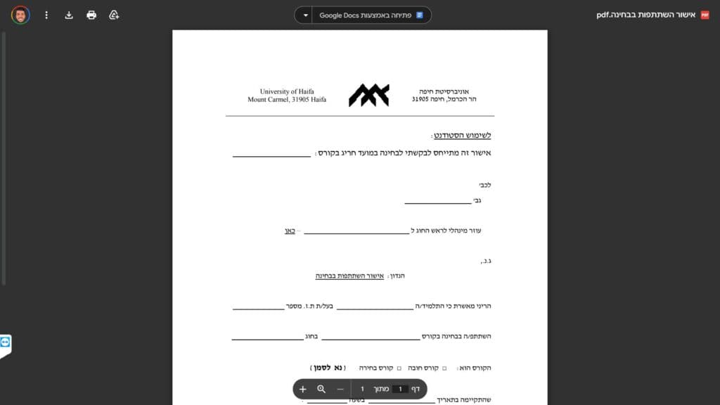 צילום מסך טופס אישור השתתפות בבחינה טופס מקוון