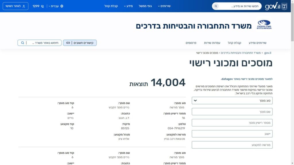 צילום מסך טופס איתור מכוני רישוי מוסמכים למבחן כשירות שנתי לרכב (טסט) טופס מקוון