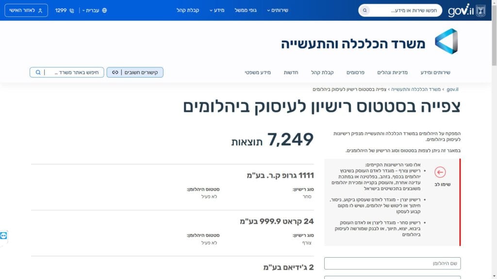 צילום מסך טופס בדיקת סטטוס רישיון לעיסוק ביהלומים טופס מקוון