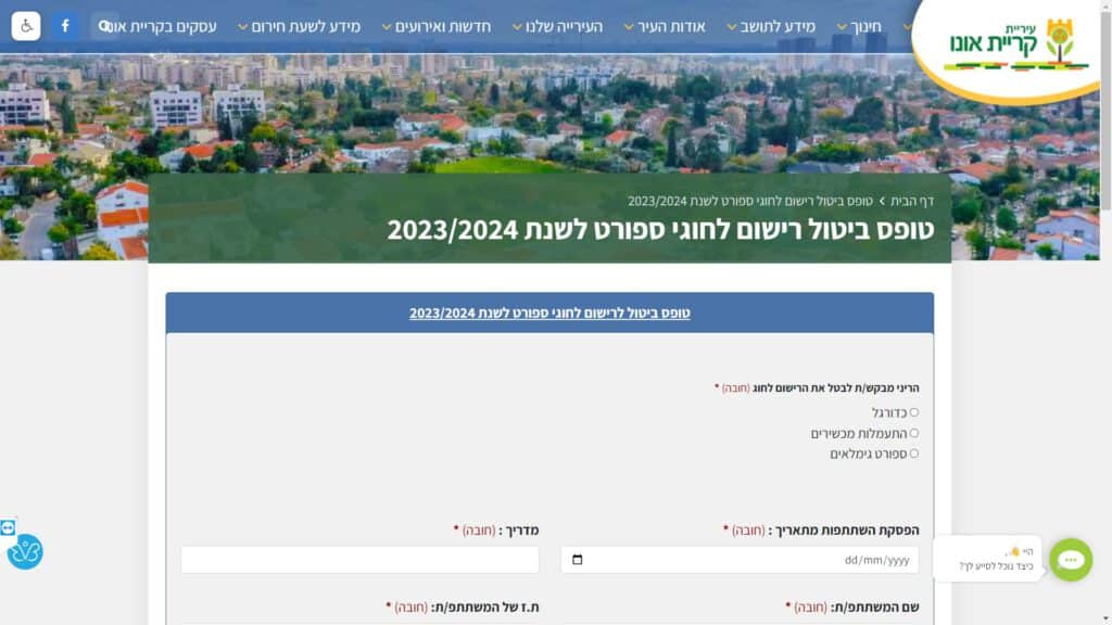טופס קל » עיריות » עיריות בתל אביב והמרכז » עיריית קריית אונו » אגף הספורט » טופס ביטול רישום לחוג לשנת 2023 – 24