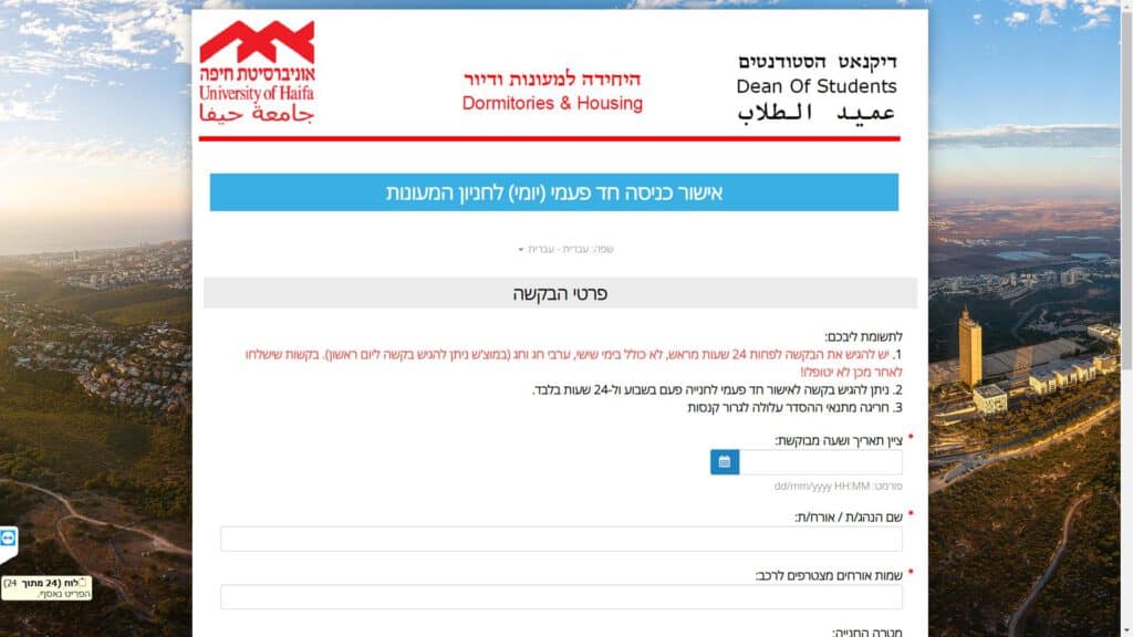 טופס קל » מוסדות לימוד » אוניברסיטת חיפה » היחידה למעונות ודיור » טופס בקשה לאישור כניסה חד פעמי (יומי) לחניון המעונות