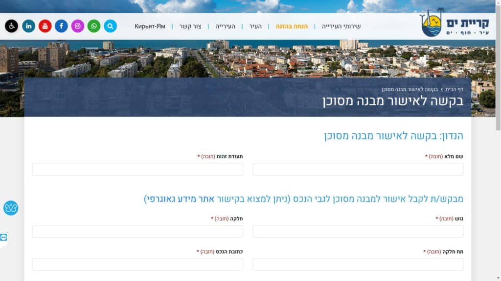 טופס קל » עיריות » עיריות בחיפה והקריות » עיריית קרית ים » הנדסה » טופס בקשה לאישור מבנה מסוכן