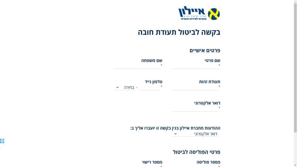 טופס קל » חברות ביטוח » איילון ביטוח » ביטוח רכב » טופס בקשה לביטול תעודת חובה – ביטוח רכב