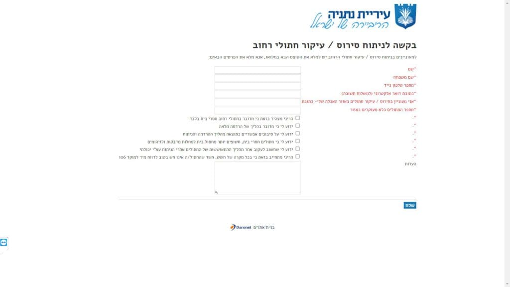 טופס קל » עיריות » עיריות בשרון » עיריית נתניה » השירות הווטרינרי העירוני » טופס בקשה לביצוע סירוס / עיקור חתולי רחוב