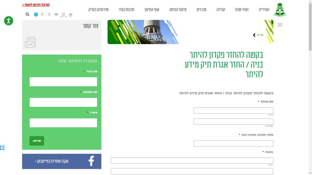צילום מסך טופס בקשה להחזר פקדון להיתר בניה / החזר אגרת תיק מידע להיתר טופס מקוון