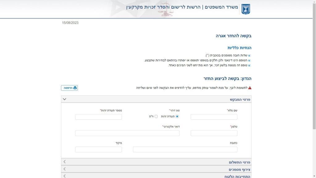 צילום מסך טופס בקשה להחזר תשלום אגרה - מהרשות לרישום והסדר זכויות מקרקעין טופס מקוון