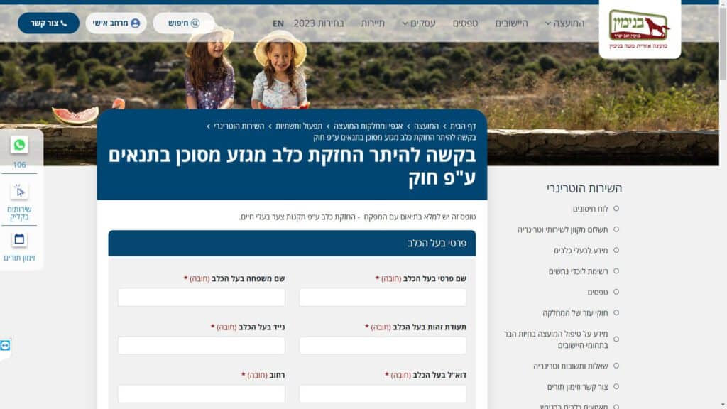 צילום מסך טופס בקשה להיתר החזקת כלב מגזע מסוכן בתנאים ע"פ חוק טופס מקוון
