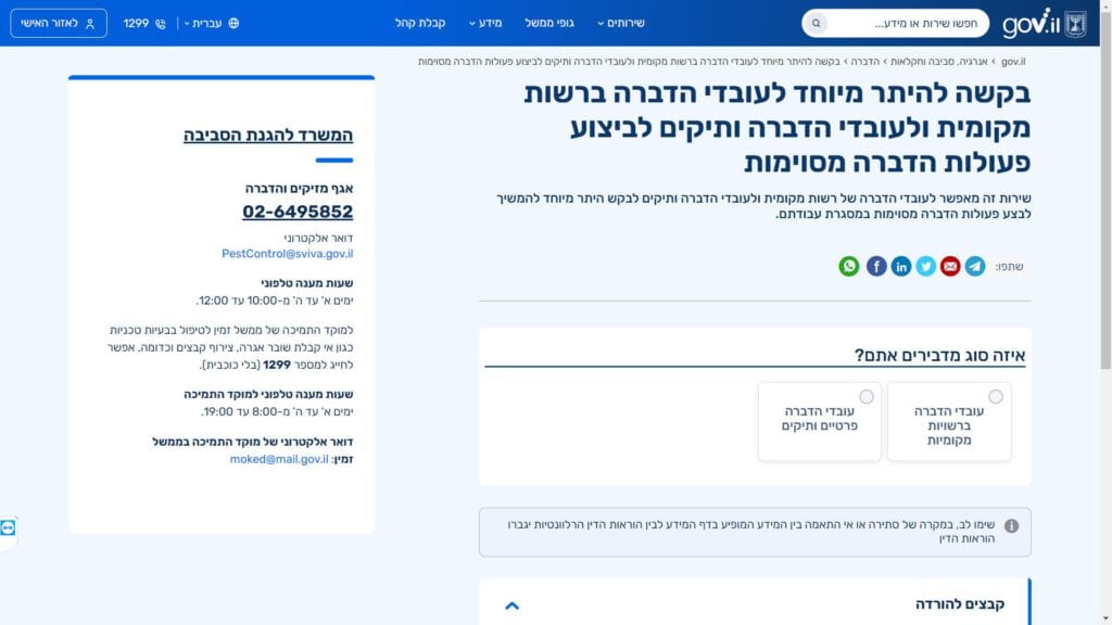 צילום מסך טופס בקשה להיתר מיוחד לעובדי הדברה ברשות מקומית ולעובדי הדברה טופס מקוון
