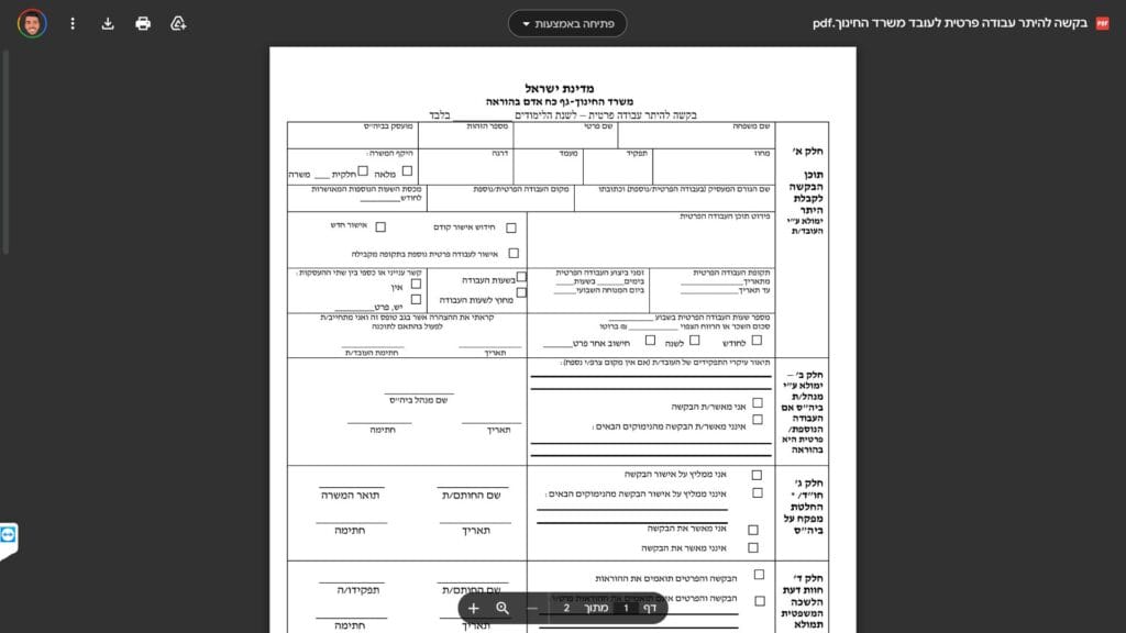 בתחילת המדריך צירפנו עבורך קישור להורדת טופס בקשה להיתר עבודה פרטית. יש ללחוץ על הכפתור ואתה תעבור להורדת הטופס. במידה והינך גולש ממכשיר סלולרי או אייפון לדוגמא שלא מתחיל את ההורדה בצורה מיידית, תוכל לגלול מטה במאמר אל הטופס לצפייה ישירה ולהוריד אותו משם אל המכשיר.