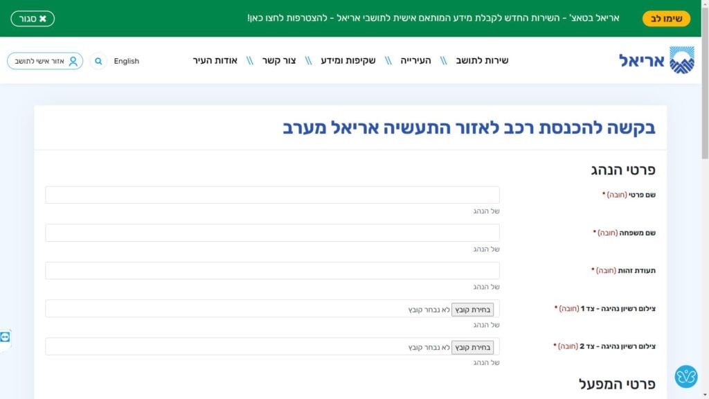 צילום מסך טופס בקשה להכנסת רכב לאזור התעשיה אריאל מערב טופס מקוון