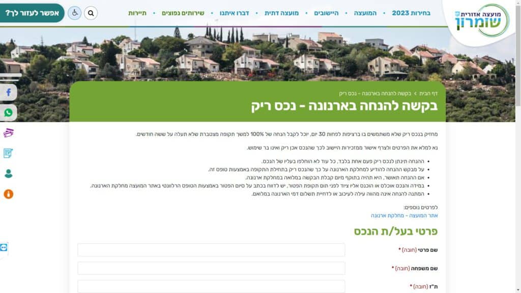 צילום מסך טופס בקשה להנחה בארנונה - נכס ריק טופס מקוון