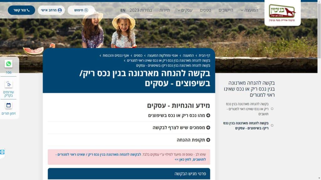 צילום מסך טופס בקשה להנחה מארנונה בגין נכס ריק / בשיפוצים - עסקים טופס מקוון