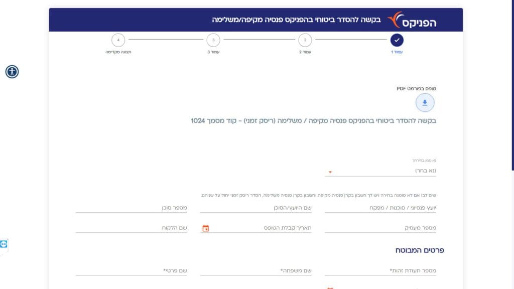 צילום מסך טופס בקשה להסדר ביטוחי בהפניקס פנסיה מקיפה / משלימה (ריסק זמני) - הפניקס פנסיה טופס מקוון