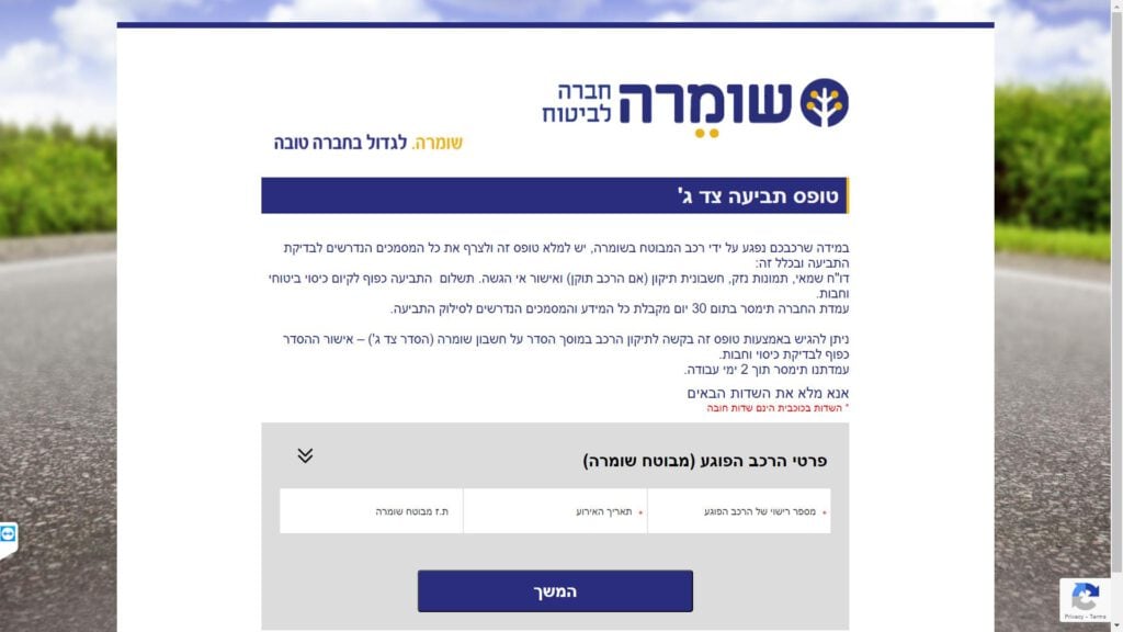 טופס קל » חברות ביטוח » שומרה ביטוח » רכב » טופס בקשה להסדר צד ג'