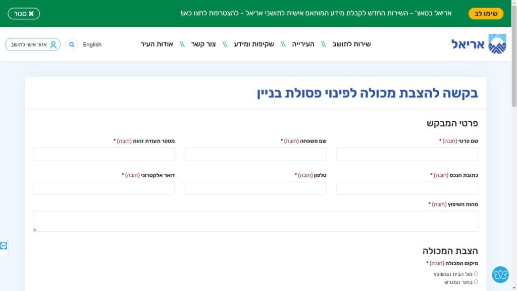 צילום מסך טופס בקשה להצבת מכולה לפינוי פסולת בניין טופס מקוון
