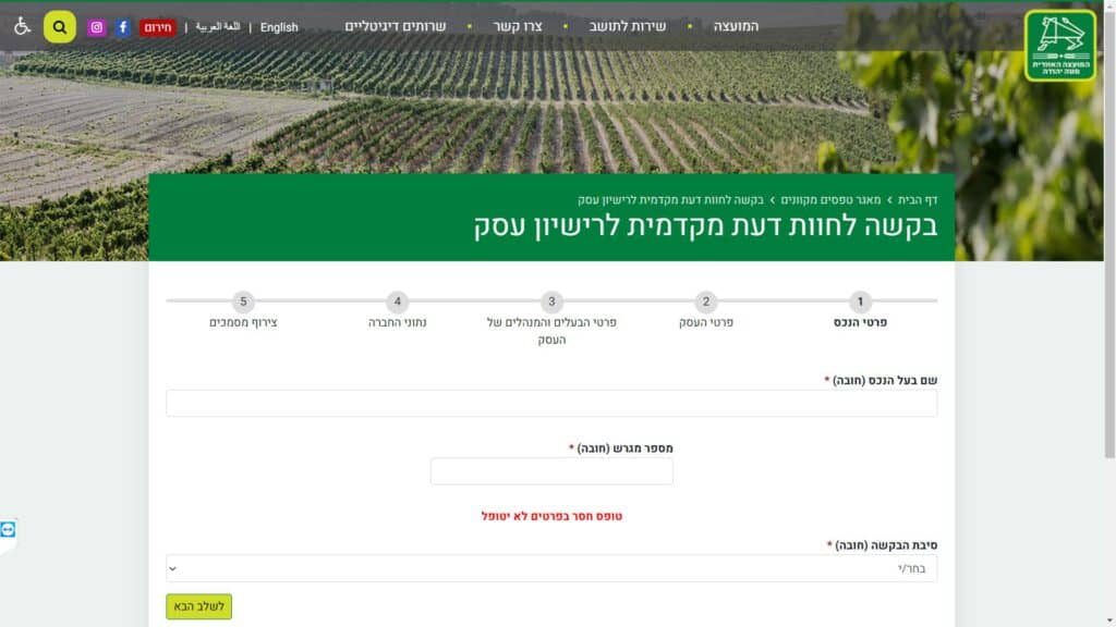 צילום מסך טופס בקשה לחוות דעת מקדמית לרישיון עסק טופס מקוון