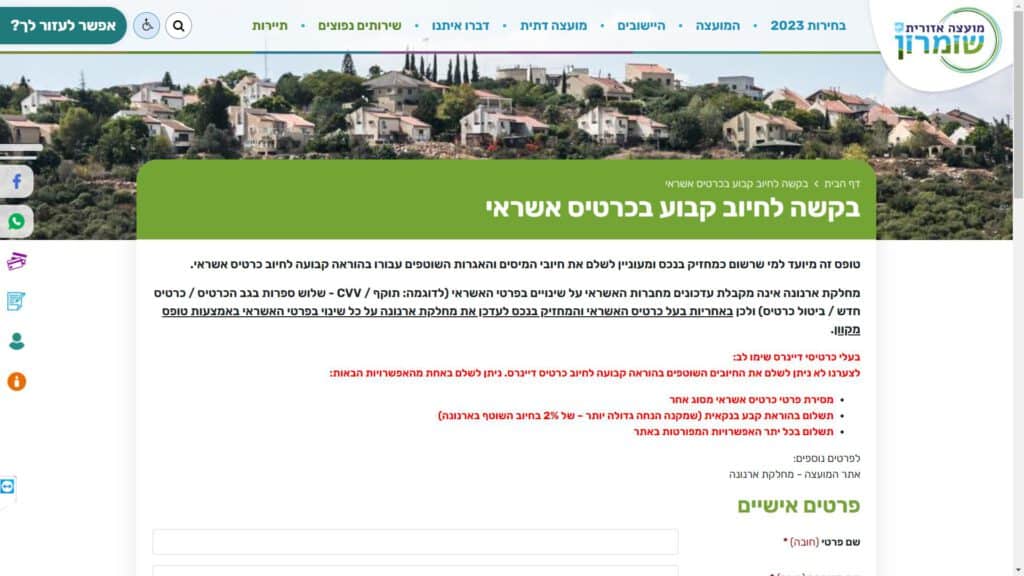 צילום מסך טופס בקשה לחיוב קבוע בכרטיס אשראי טופס מקוון