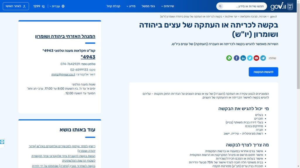צילום מסך טופס בקשה לכריתה או העתקה של עצים ביהודה ושומרון (יו"ש) טופס מקוון