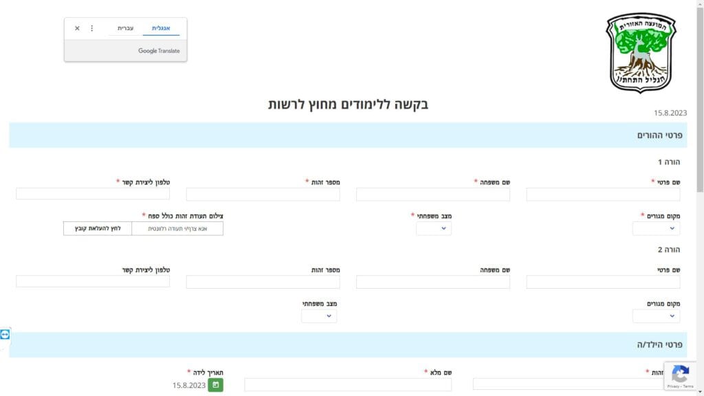 צילום מסך טופס בקשה ללימודים מחוץ לרשות טופס מקוון