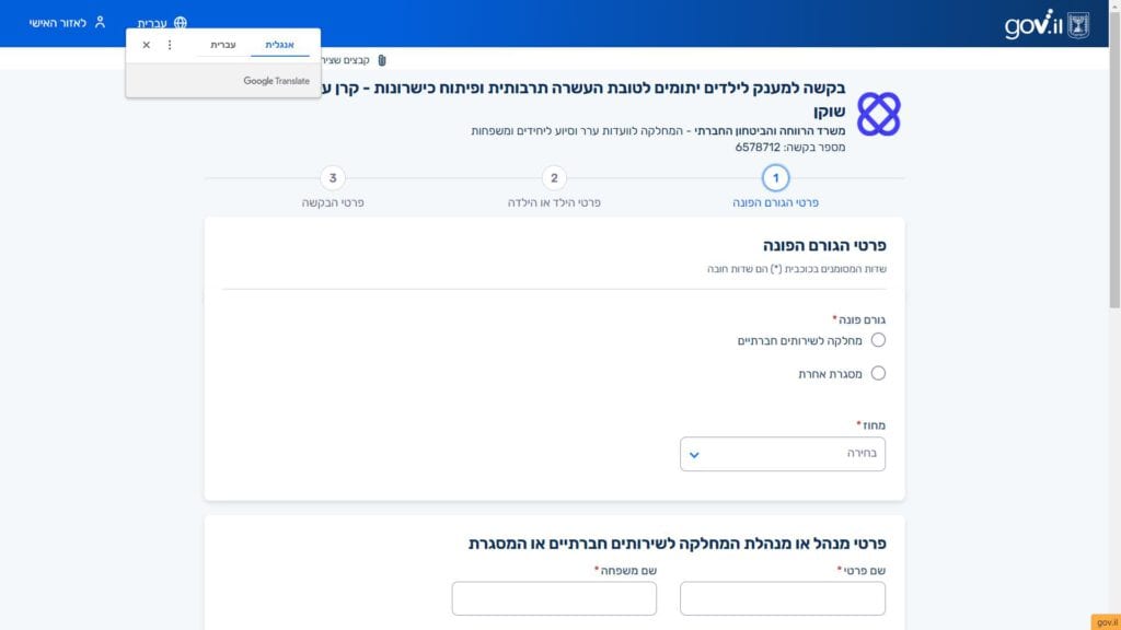 צילום מסך טופס בקשה למענק לילדים יתומים לטובת העשרה תרבותית ופיתוח כישרונות טופס מקוון