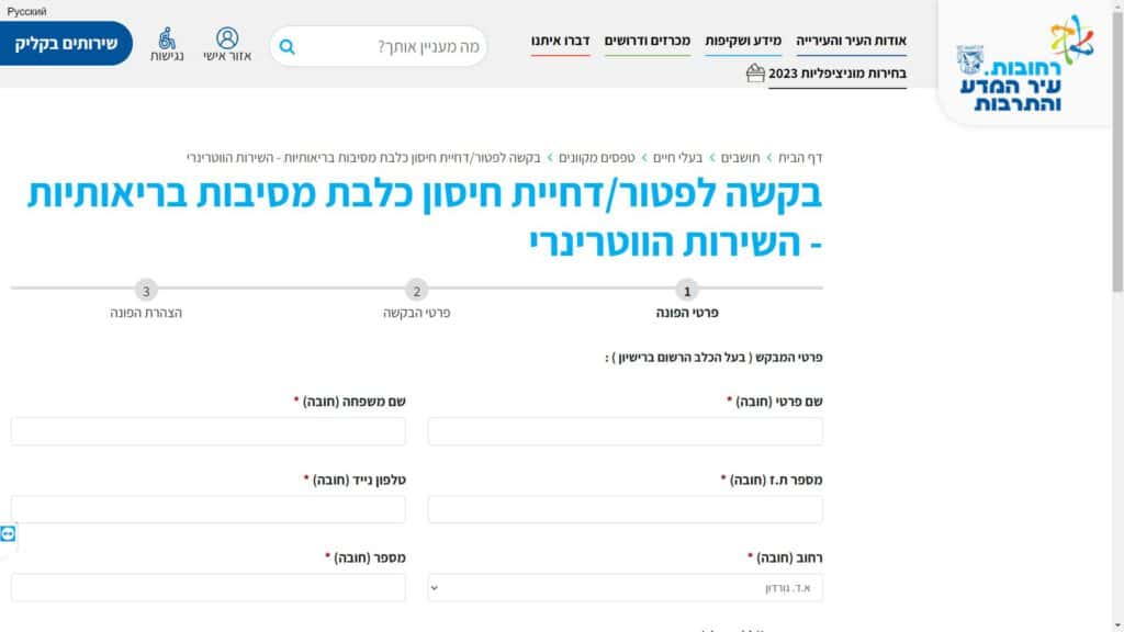 טופס קל » עיריות » עיריות בשפלה » עיריית רחובות » בעלי חיים » טופס בקשה לפטור / דחיית חיסון כלבת מסיבות בריאותיות – השירות הווטרינרי