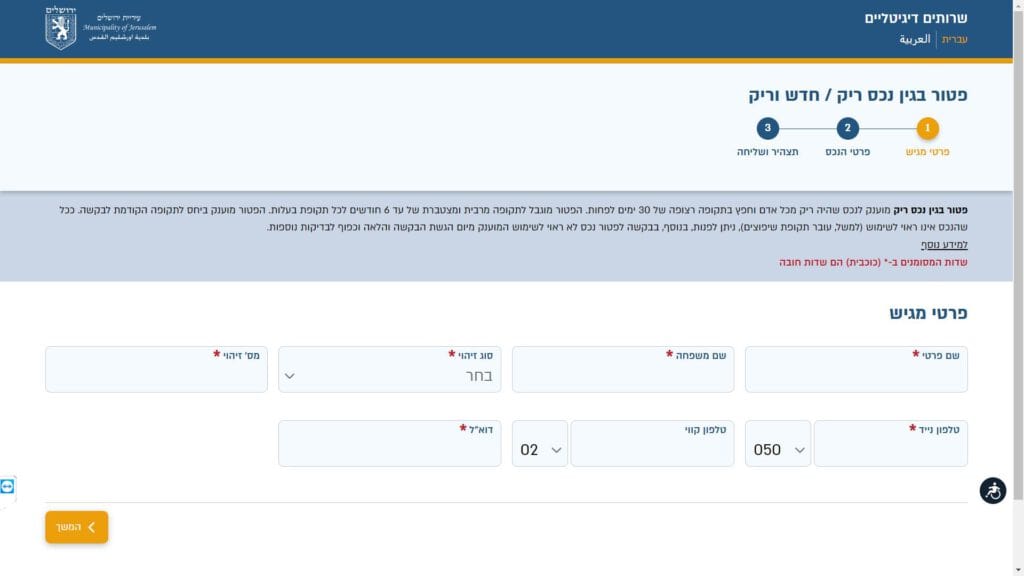 טופס בקשה לפטור מארנונה בגין נכס ריק / חדש וריק חלופה נגישה - כרגע לא קיימת.