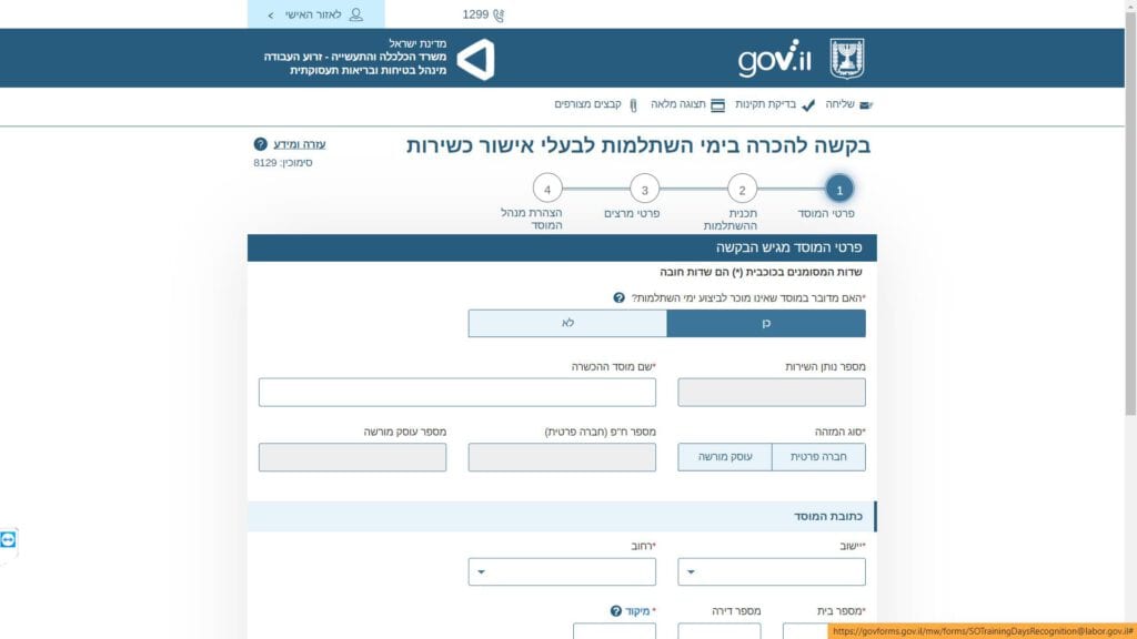 צילום מסך טופס בקשה לקבלת אישור הכרה על ימי השתלמות בבטיחות ובבריאות תעסוקתית טופס מקוון