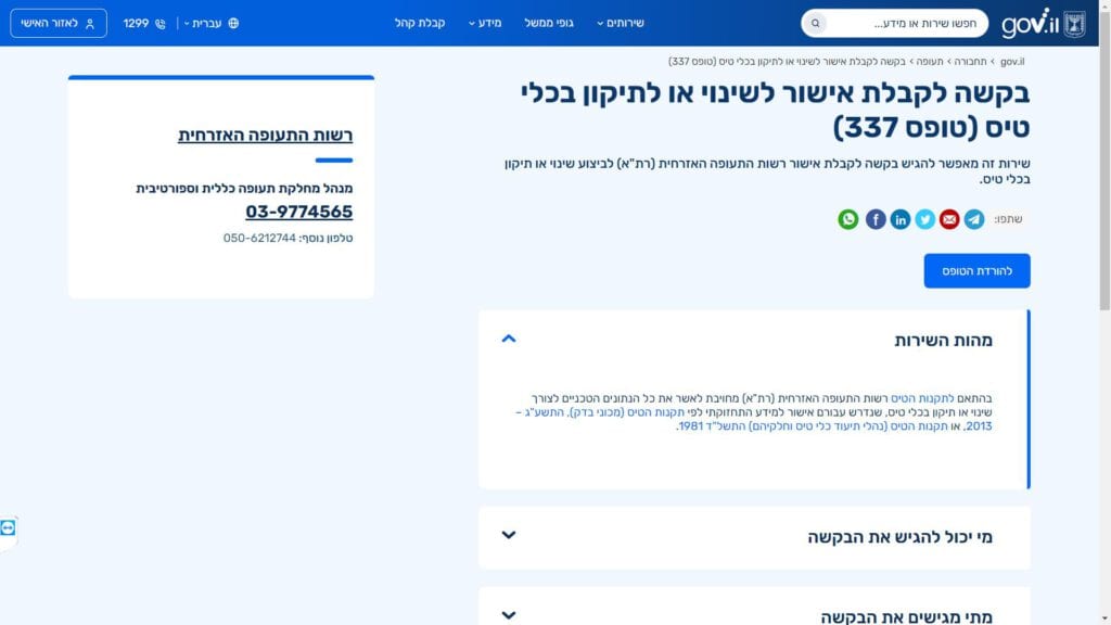 טופס בקשה לקבלת אישור לשינוי או לתיקון בכלי טיס (טופס 337) להורדה והדפסה - טופס PDF זמין במעלה העמוד.