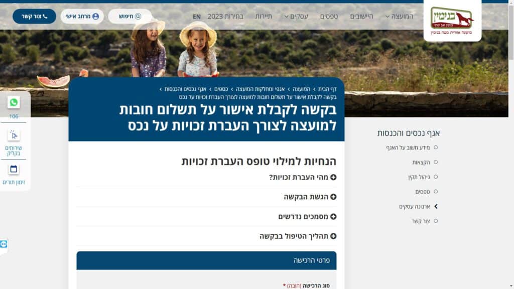 צילום מסך טופס בקשה לקבלת אישור על תשלום חובות למועצה לצורך העברת זכויות על נכס טופס מקוון