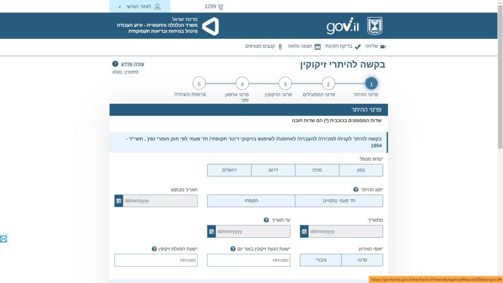 צילום מסך טופס בקשה לקבלת היתר להפעלת זיקוקין די - נור טופס מקוון