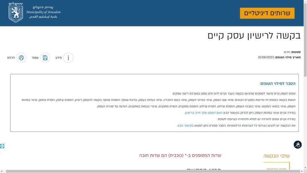 צילום מסך טופס בקשה לקבלת היתר להצבת מתקנים במרחב הציבורי טופס מקוון
