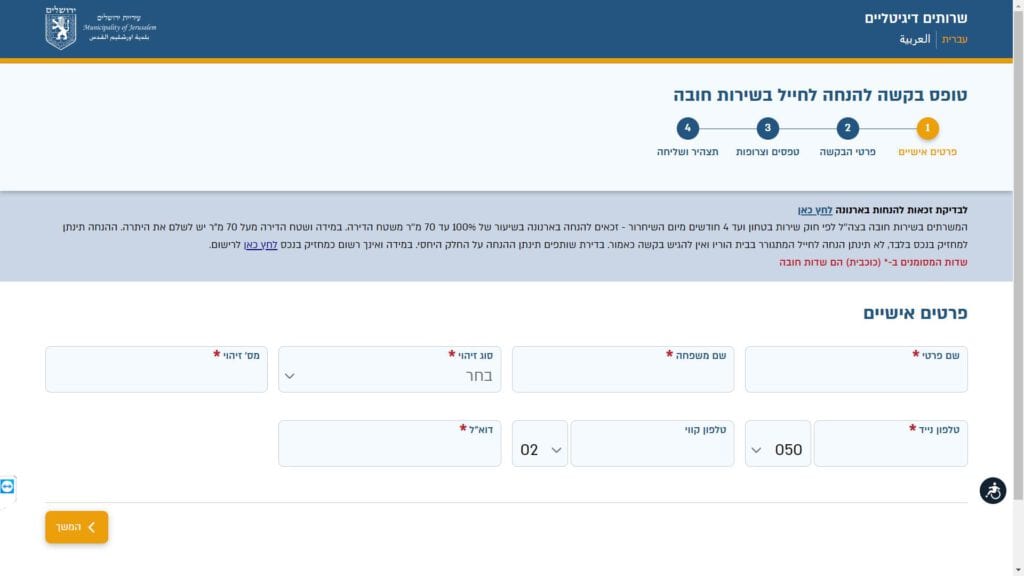 טופס בקשה לקבלת הנחה בארנונה לחייל בשירות חובה חלופה נגישה - כרגע לא קיימת.