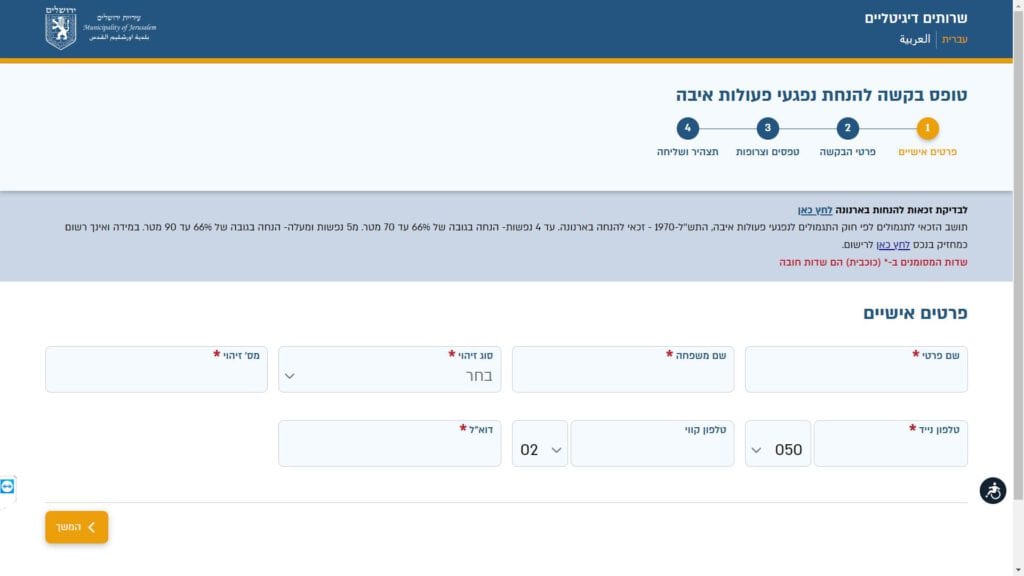 צילום מסך טופס בקשה לקבלת הנחה בארנונה לנפגעי פעולות איבה טופס מקוון