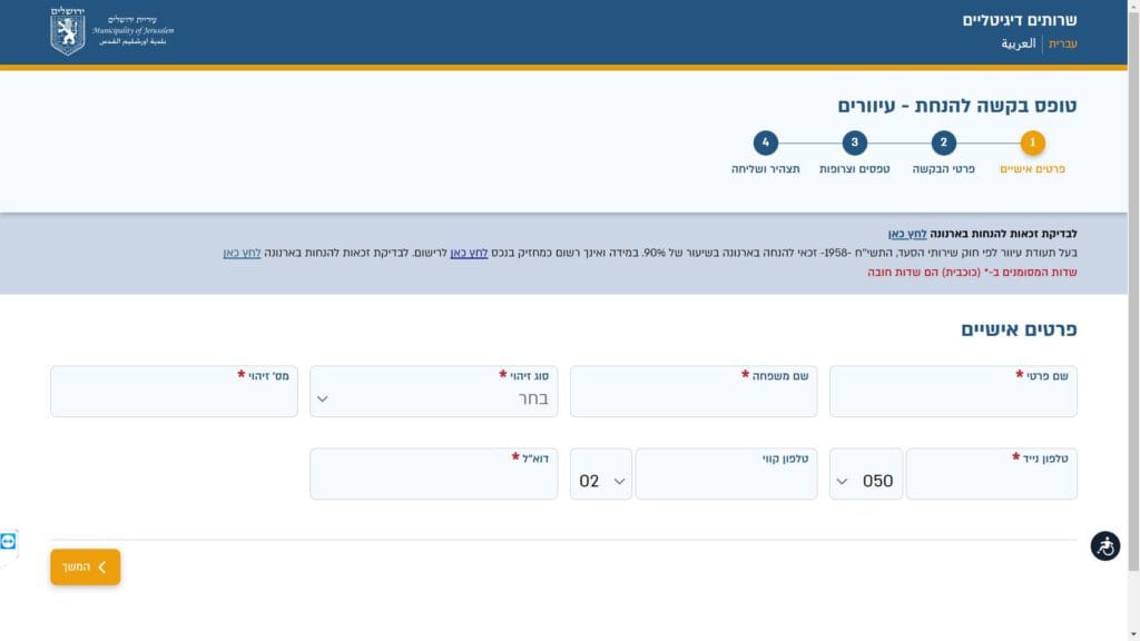 צילום מסך טופס בקשה לקבלת הנחה בארנונה לעיוורים טופס מקוון
