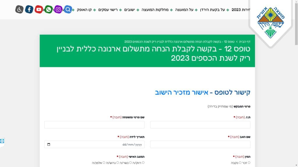 טופס קל » עיריות » עיריות ביהודה ושומרון » מועצה אזורית בקעת הירדן » גביה וארנונה » טופס בקשה לקבלת הנחה מתשלום ארנונה כללית לבניין ריק לשנת הכספים 2023