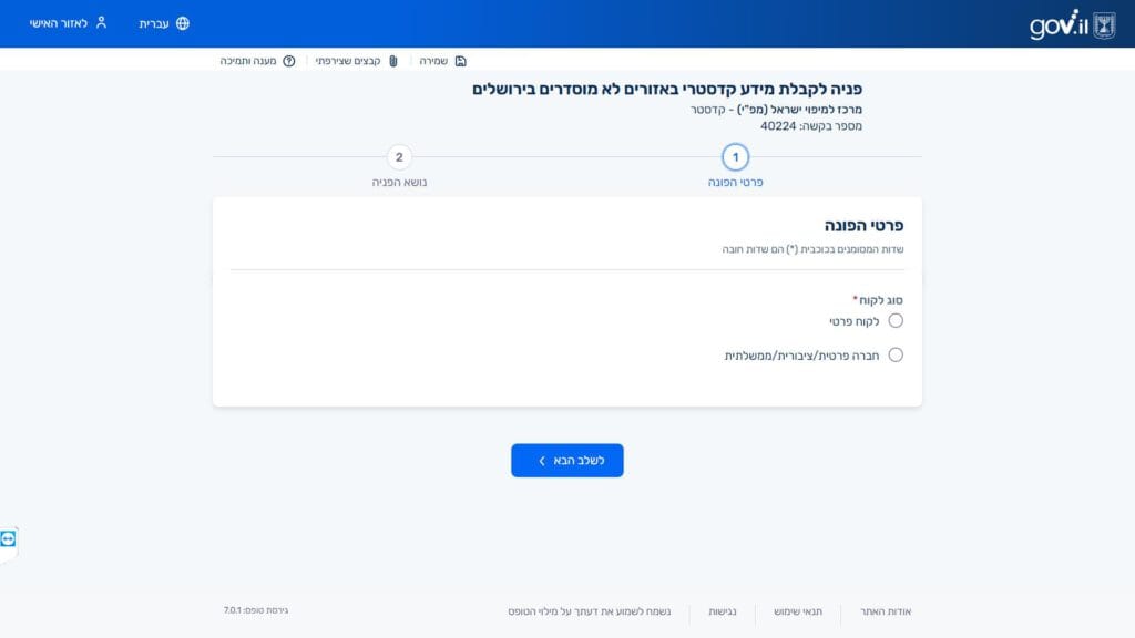 צילום מסך טופס בקשה לקבלת מידע קדסטרי על אזור לא מוסדר בירושלים טופס מקוון
