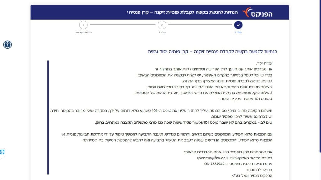 צילום מסך טופס בקשה לקבלת פנסיית זיקנה - קרן פנסיה יסוד עמית - הפניקס פנסיה טופס מקוון