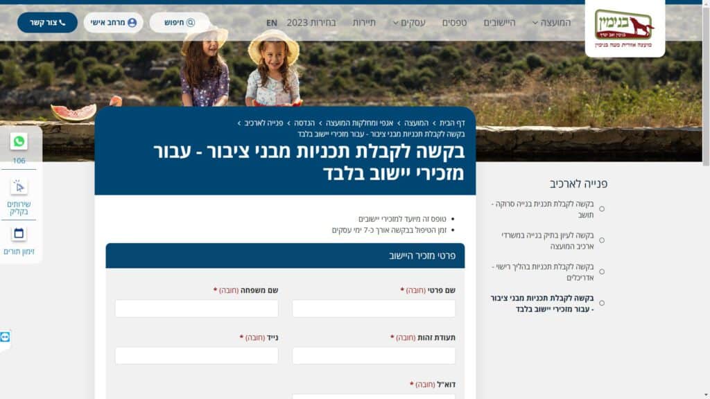 צילום מסך טופס בקשה לקבלת תכניות מבני ציבור - עבור מזכירי יישוב בלבד טופס מקוון