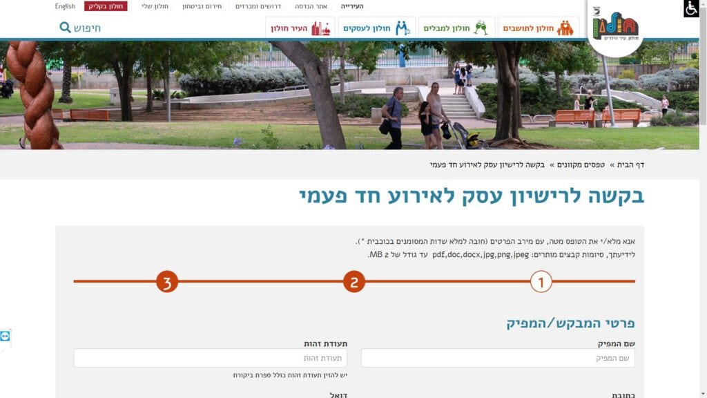 טופס קל » עיריות » עיריות בתל אביב והמרכז » עיריית חולון » עסקים » טופס בקשה לרישוי אירוע חד פעמי