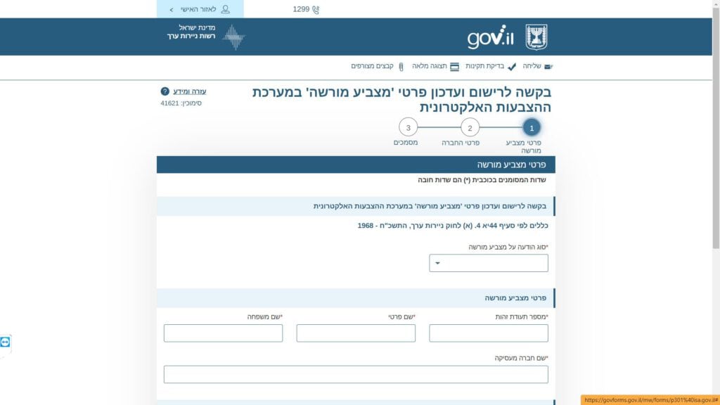 צילום מסך טופס בקשה לרישום ועדכון פרטי 'מצביע מורשה' במערכת ההצבעות האלקטרונית טופס מקוון