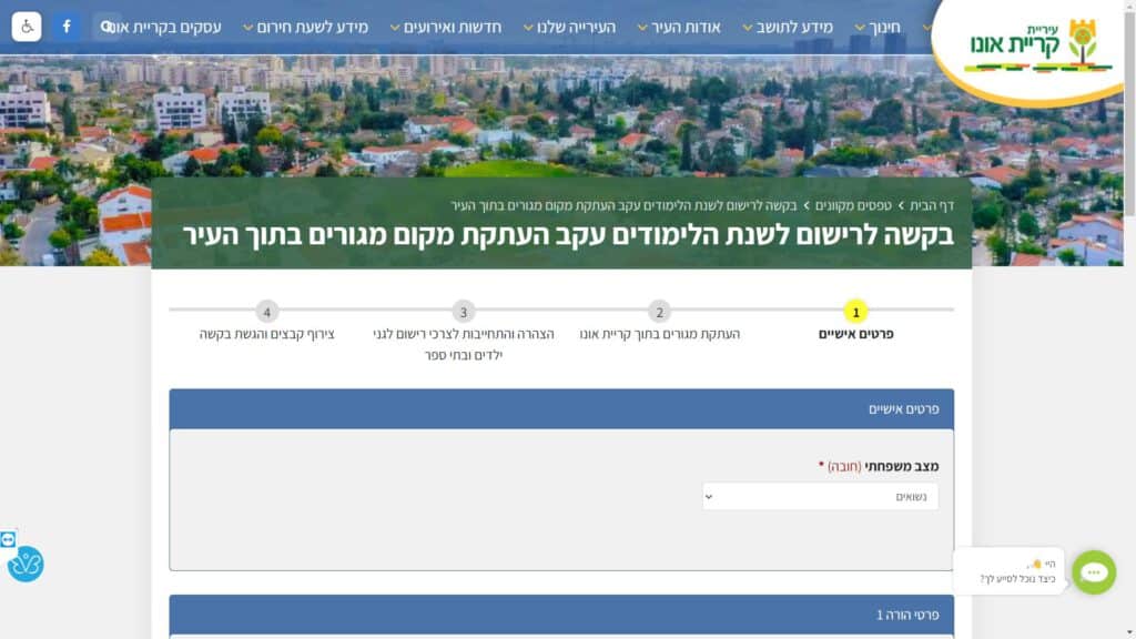 צילום מסך טופס בקשה לרישום לשנת הלימודים עקב העתקת מקום מגורים בתוך העיר - בתי ספר טופס מקוון