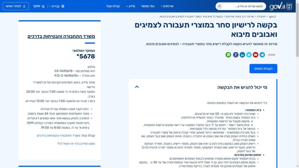 צילום מסך טופס בקשה לרישיון סחר במוצרי תעבורה לצמיגים ואבובים מיבוא טופס מקוון