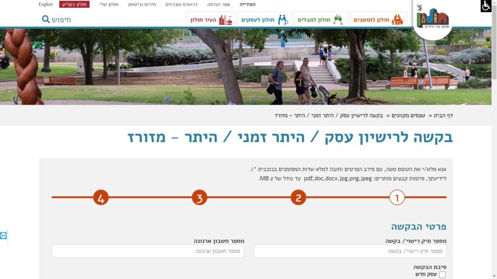 צילום מסך טופס בקשה לרישיון עסק / היתר זמני לעסק טופס מקוון